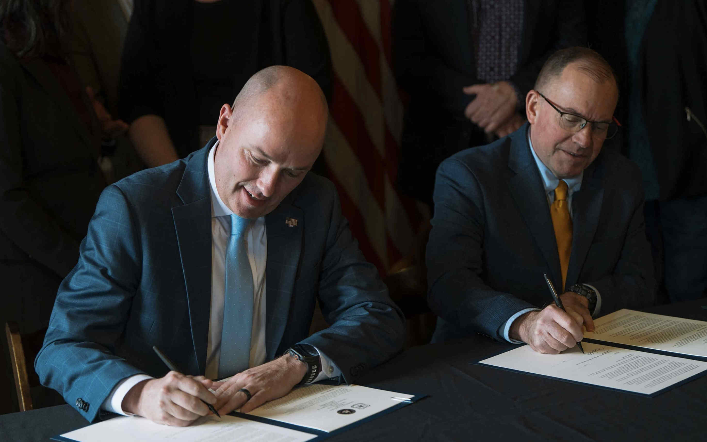 犹他州州长斯宾塞·考克斯(左)和美国林务局局长汤姆·舒尔茨(右)签署合作协议。